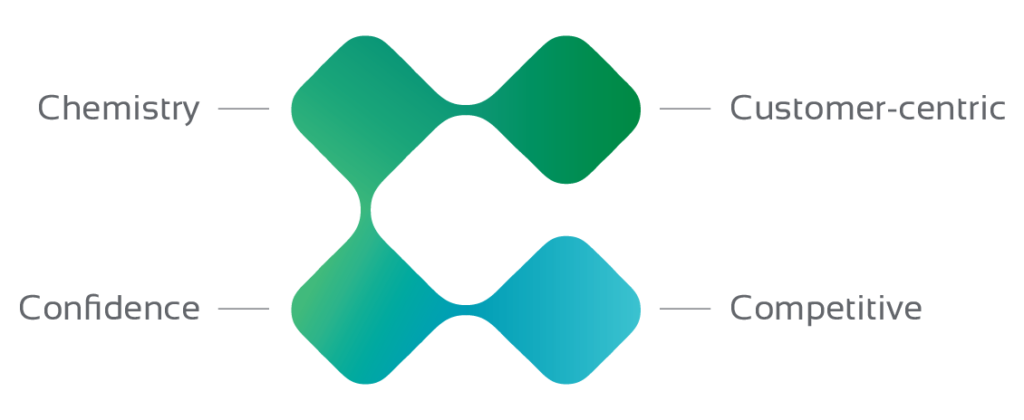 The visualization of the logo is inspired by the shape of the molecular bond, which is a common form in the chemical world. These shapes are combined to form the letter C, which is the initial letter of Chemindo. The four values mentioned above also begin with the letter C. Each shape in the visual supports one another to tell that each element in Chemindo is of the same mind and in line to move together to actualize its vision together. One end represents starting point and the other end represents finish line, symbolizing Chemindo’s movement to achieve the intended goal or vision.