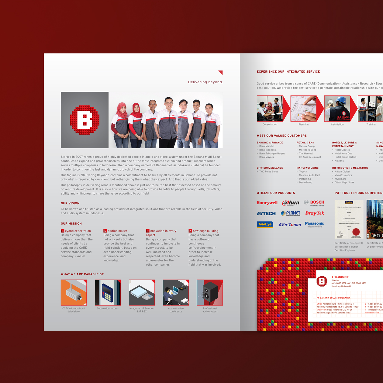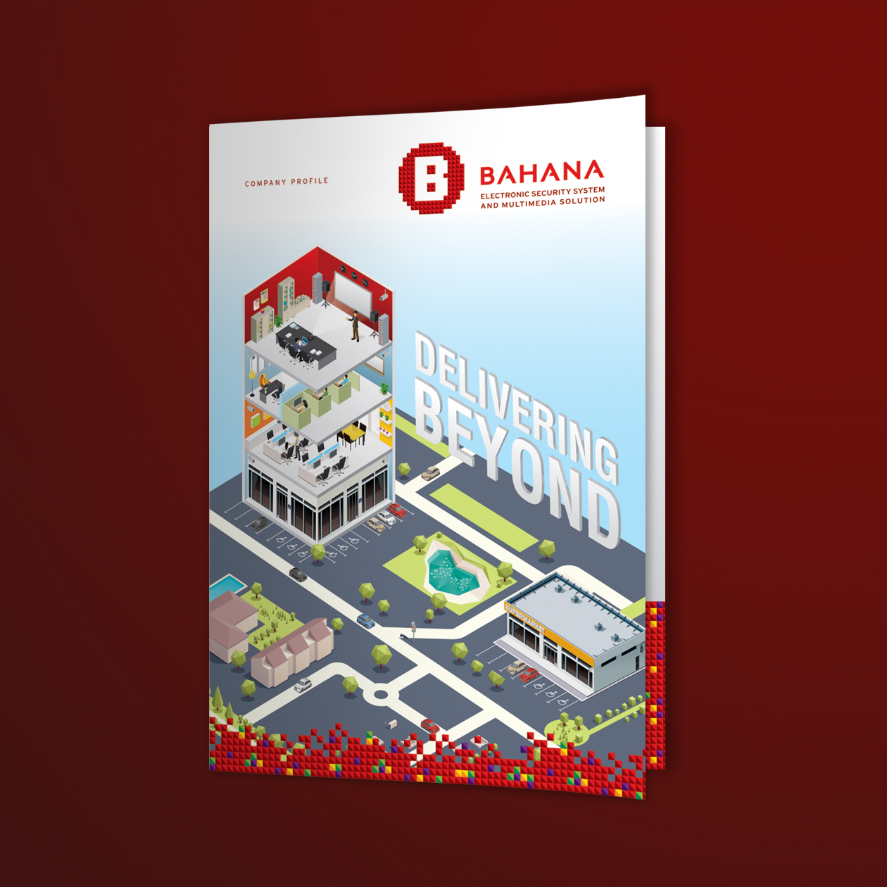 This company profile was created after the series of integrated branding projects for PT Bahana Solusi Indokarya (Bahana) was completed. The format is very concise and cost-efficient. The form of the company profile is a folder containing brochures and business cards. While the company profile, type of service, certification and list of clients or portfolios are listed on the cover of the map. The design concept is still in one theme with the formulation of brand identity that has been created and is supported by illustrations of the usefulness of the products offered by Bahana in human life, particularly depicted in sections of an office building.
